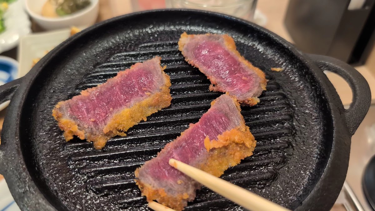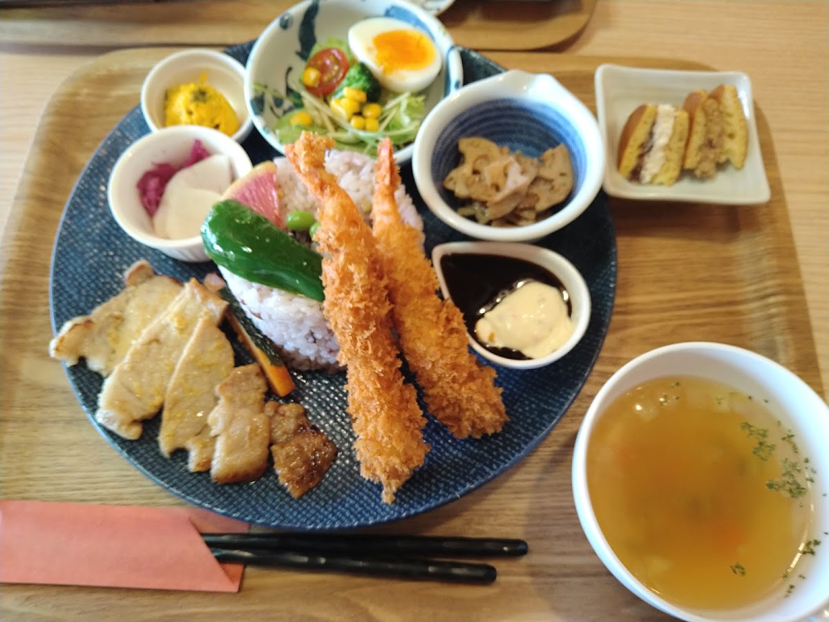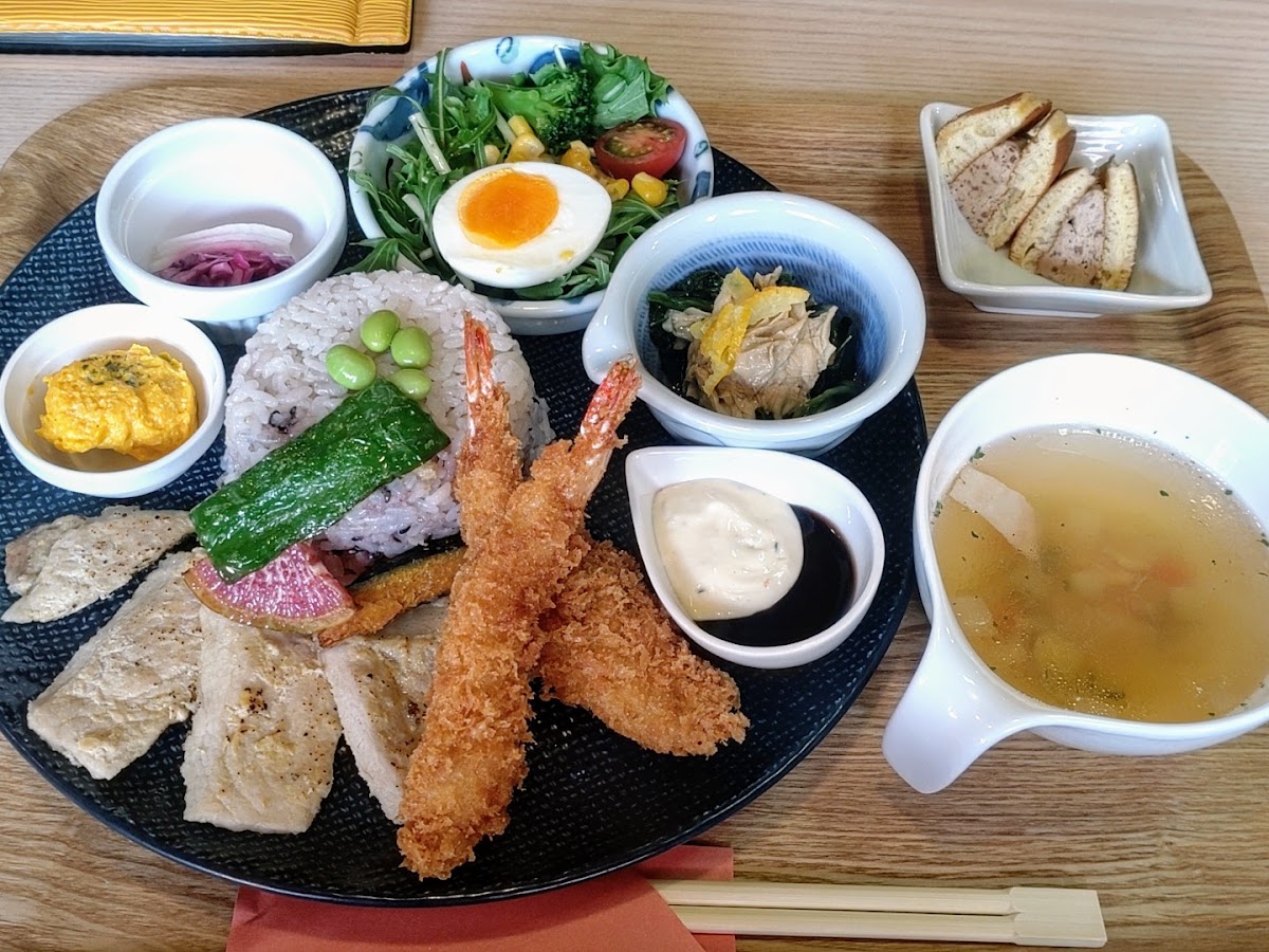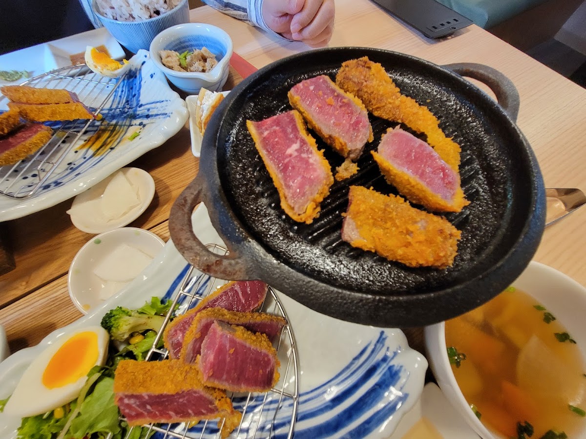 The menu shifts through the day: mornings and afternoons offer mostly café-style treats and drinks, while lunch service between 11 am and 2 pm focuses on more substantial dishes. Visitors often pick from a thoughtfully curated selection of Japanese-style café meals like 牛かつ膳 (beef cutlet set), plates featuring fried shrimp and pork miso, and rotating weekly lunch specials. The beef cutlet set is particularly popular for its interactive element—letting diners cook each piece to their ideal doneness—and it’s served with a few traditional flavorings such as apple miso and sansho pepper salt. Portion sizes come as a single standard weight these days, which some returning guests have noticed compared to earlier more flexible options.